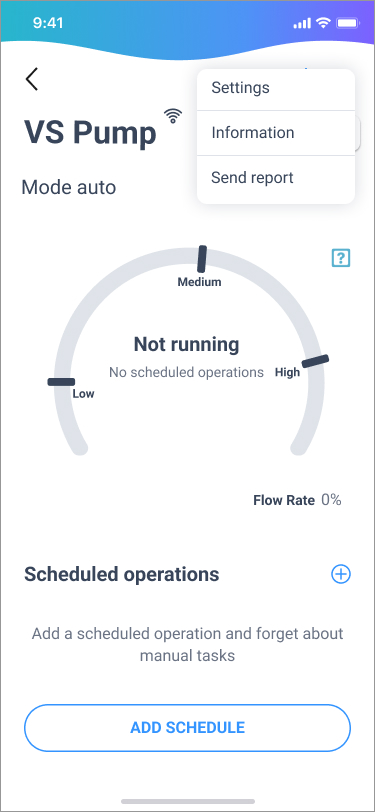 - Click on "Add Schedule" at the botttom or on the little plus icon next to Scheduled operations and create your filtration schedule. Note that only 1 timeslot per schedule is allowed. Once your finished, click on "Create Schedule" to save the changes.