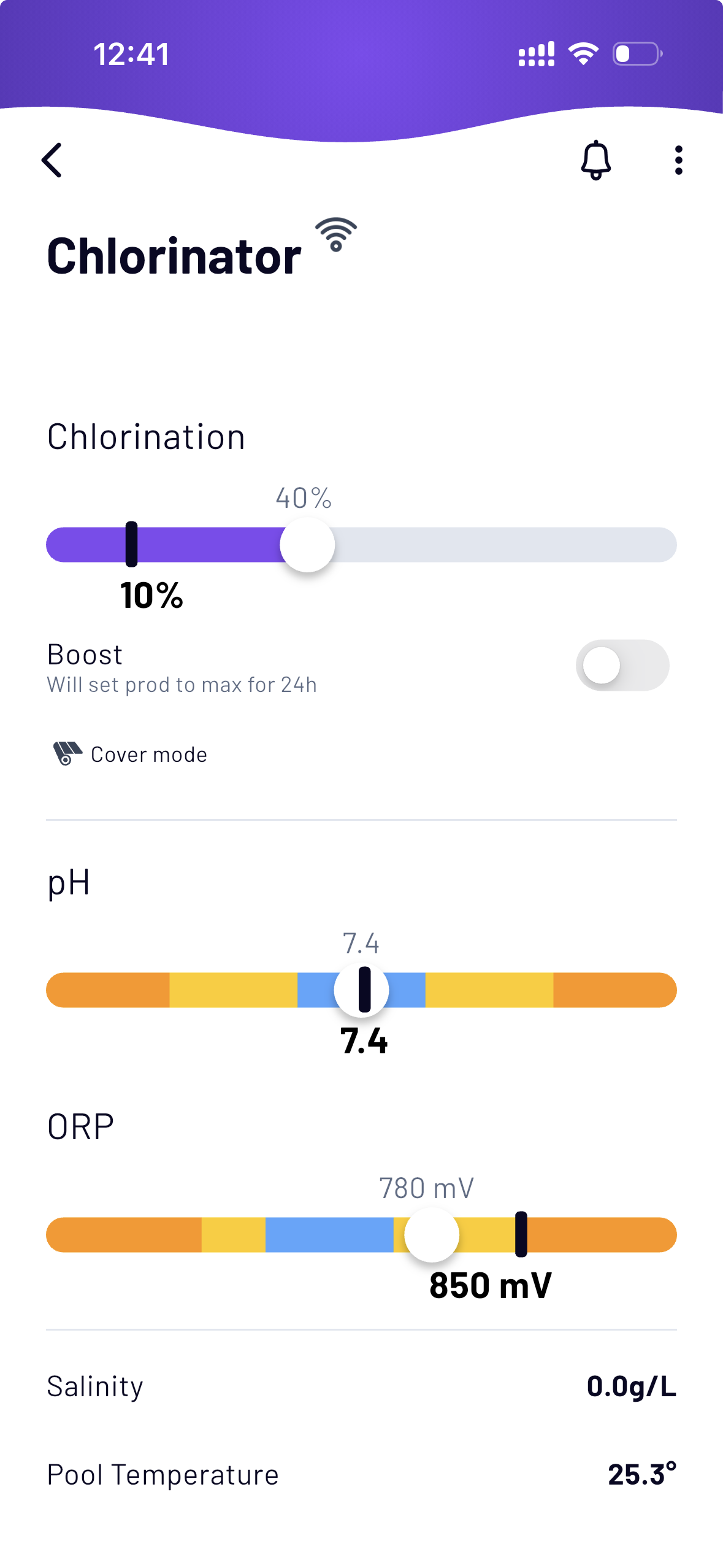 If your pool system includes a compatible chlorinator, you can adjust the chlorine production level directly from the Fluidra Pool app.